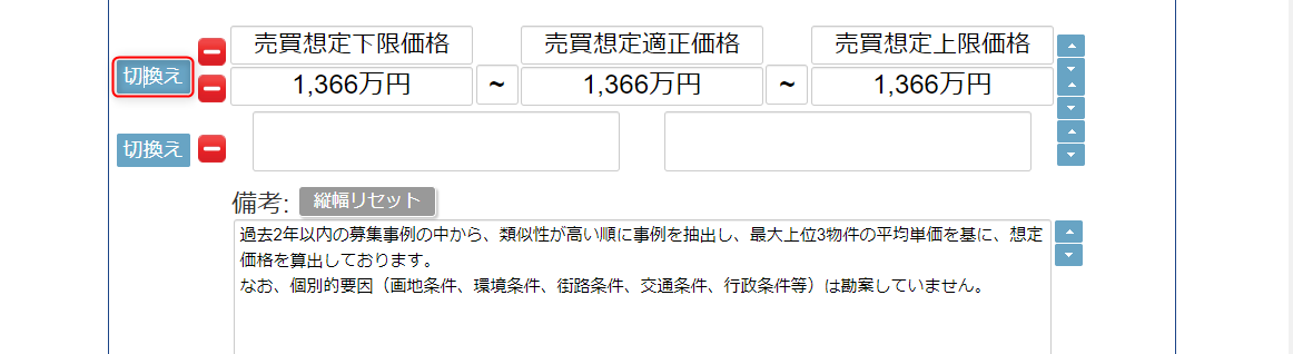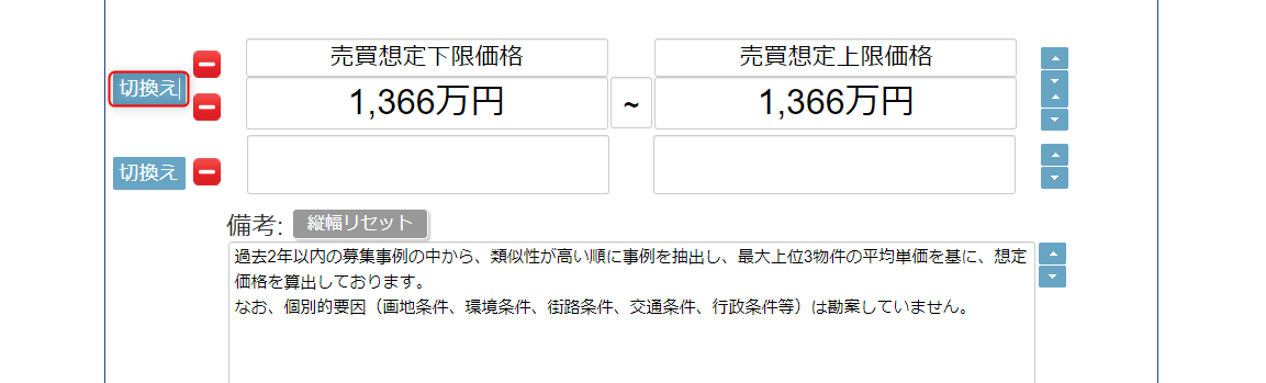 「切換え」を1回クリックする 売買想定下限価格と売買想定上限価格は直接入力変更できます。