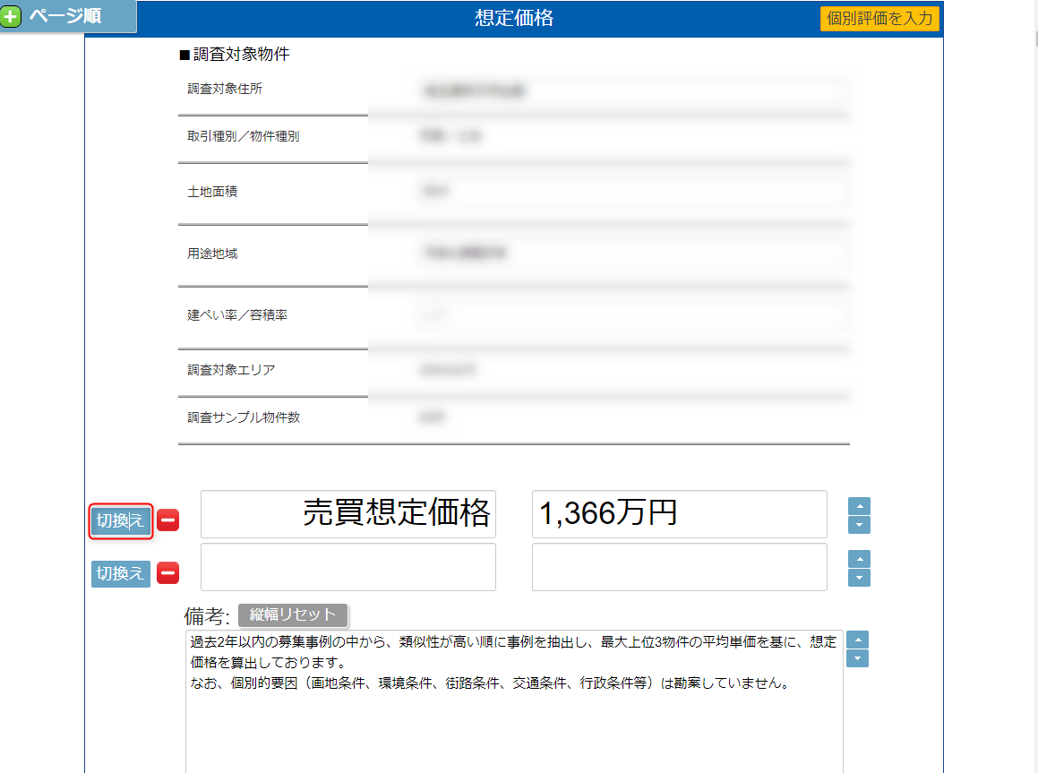 「切換え」を2回クリックする 売買想定下限価格、売買想定適正価格、売買想定上限価格は直接入力変更できます。